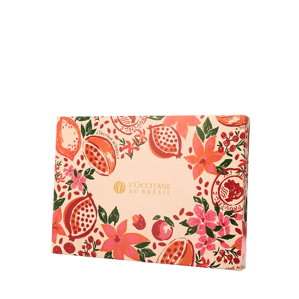 Esta composição contém Geleia Esfoliante Romã, Spray Perfumado Romã, Geleia Hidratante Desodorante Corporal Romã e Caixa Presenteável. Inspirada nos doces de compotas brasileiros, essa linha traz para sua rotina um vibrante acorde de frutas vermelhas, delicadamente envolvido por um corpo floral com notas de muget e e gerânio, envelopado por um fundo amadeirado e âmbar.